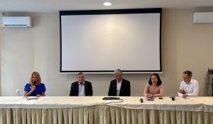 Z leve: Bernarda Žarn, povezovalka novinarske konference, Franc Špegel, predsednik Društva revmatikov Slovenije, dr. Aleš Ambrožič, dr. med., spec. interne medicine in revmatologije, s Kliničnega oddelka za revmatologijo UKC Ljubljana, Petra Zajc, Strokovna sodelavka Društva revmatikov Slovenije, doc. dr. Žiga Rotar, dr. med., spec. revmatologije, predstojnik Kliničnega oddelka za revmatologijo UKC Ljubljana.