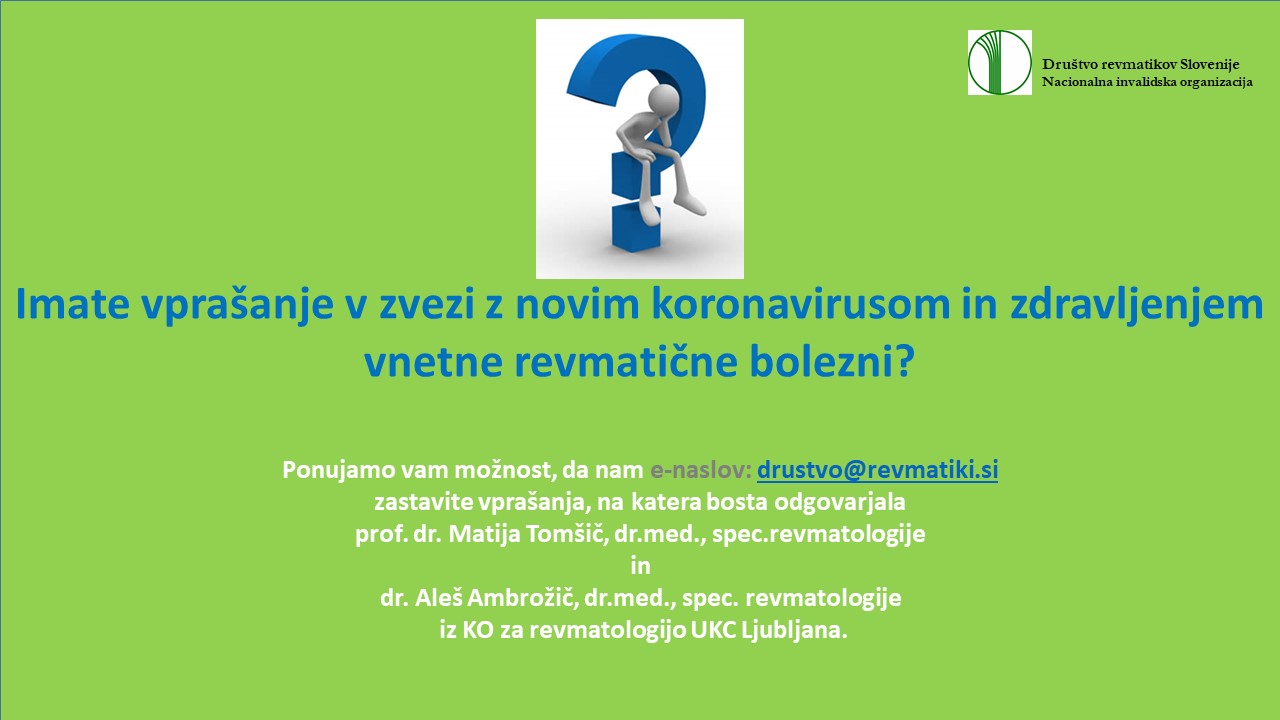 ker se zavedamo, da se vam porajajo številna vprašanja v zvezi z novim koronavirusom in zdravljenjem vaše vnetne revmatične bolezni, vam ponujamo možnost, da nam zastavite vprašanja, na katera bosta odgovarjala prof. dr. Matija Tomšič, dr.med., spec.revmatologije in dr. Aleš Ambrožič, dr.med., spec. revmatologije iz KO za revmatologijo UKC Ljubljana.